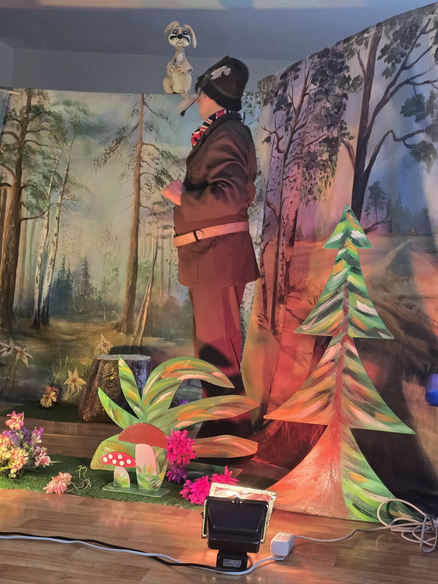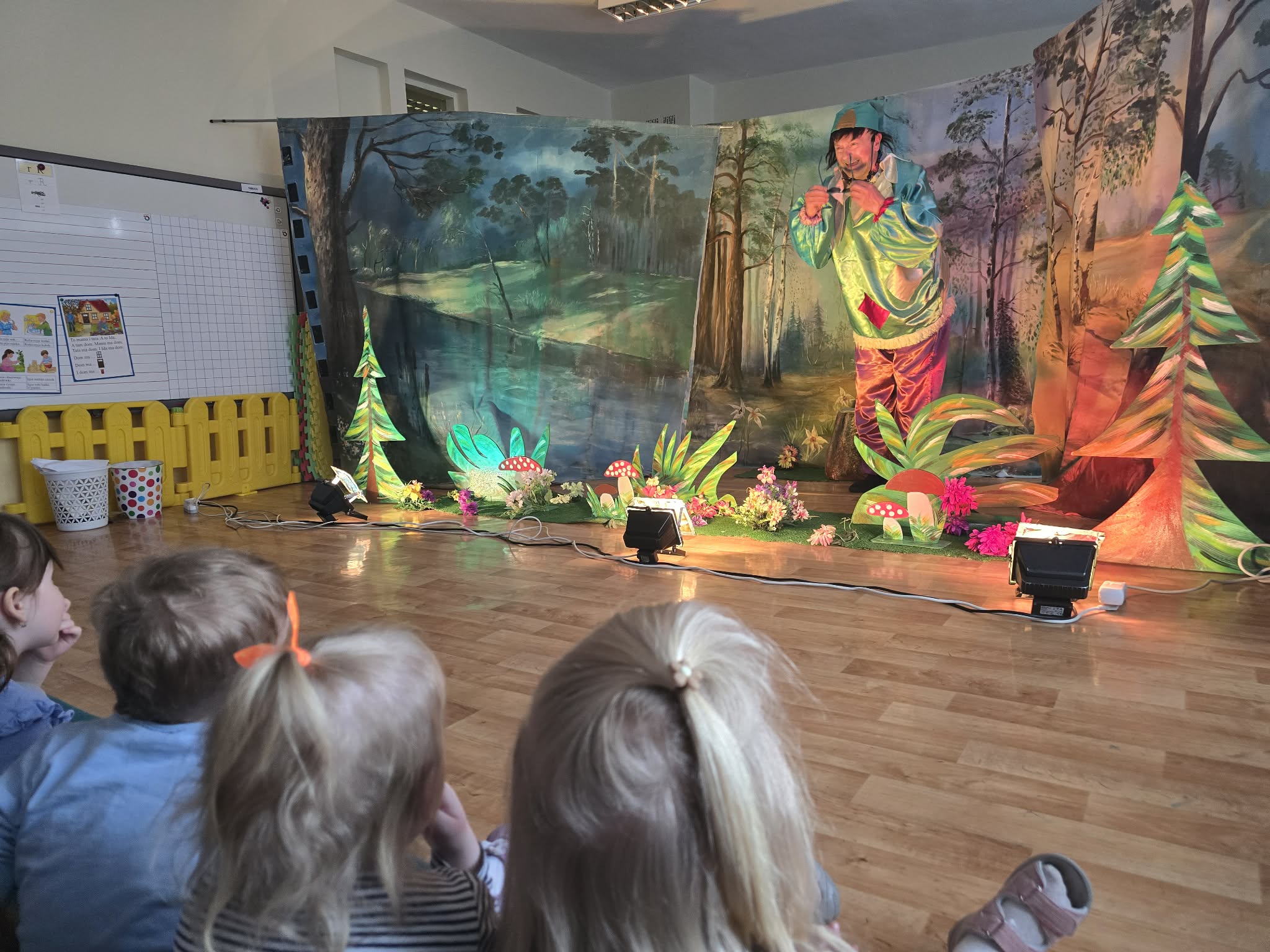 W dniu 17 kwietnia do naszego przedszkola przyjechali aktorzy ze spektaklem pt. ,,Powrót do krainy baśni ". Dzieci towarzyszyły aktorom w podróży pełnej fascynujących przygód - poznając losy głównych bohaterów Agnieszki - wnuczki oraz dziadka gajowego. Mali widzowie śledzili losy dziewczynki, która szla przez las do chatki dziadka, jednak po drodze zgubiła się i nie wiedziała gdzie ma iść ? Okazało się, że to Chochlik Magika, który specjalnie plątał ścieżki bohaterów...